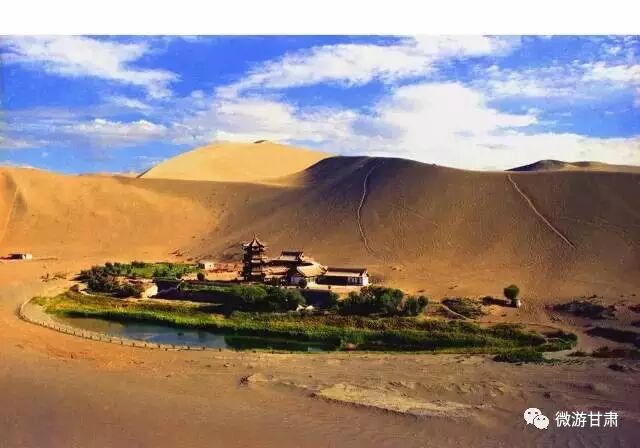 鳴沙山下,泉水形成一湖,處在沙丘環(huán)抱之中。泉在流沙中,干旱不枯竭,風(fēng)吹沙不落,蔚為奇觀。
