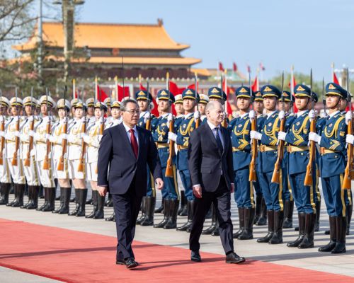 會(huì)談前,李強(qiáng)在人民大會(huì)堂東門外廣場(chǎng)為朔爾茨舉行歡迎儀式。