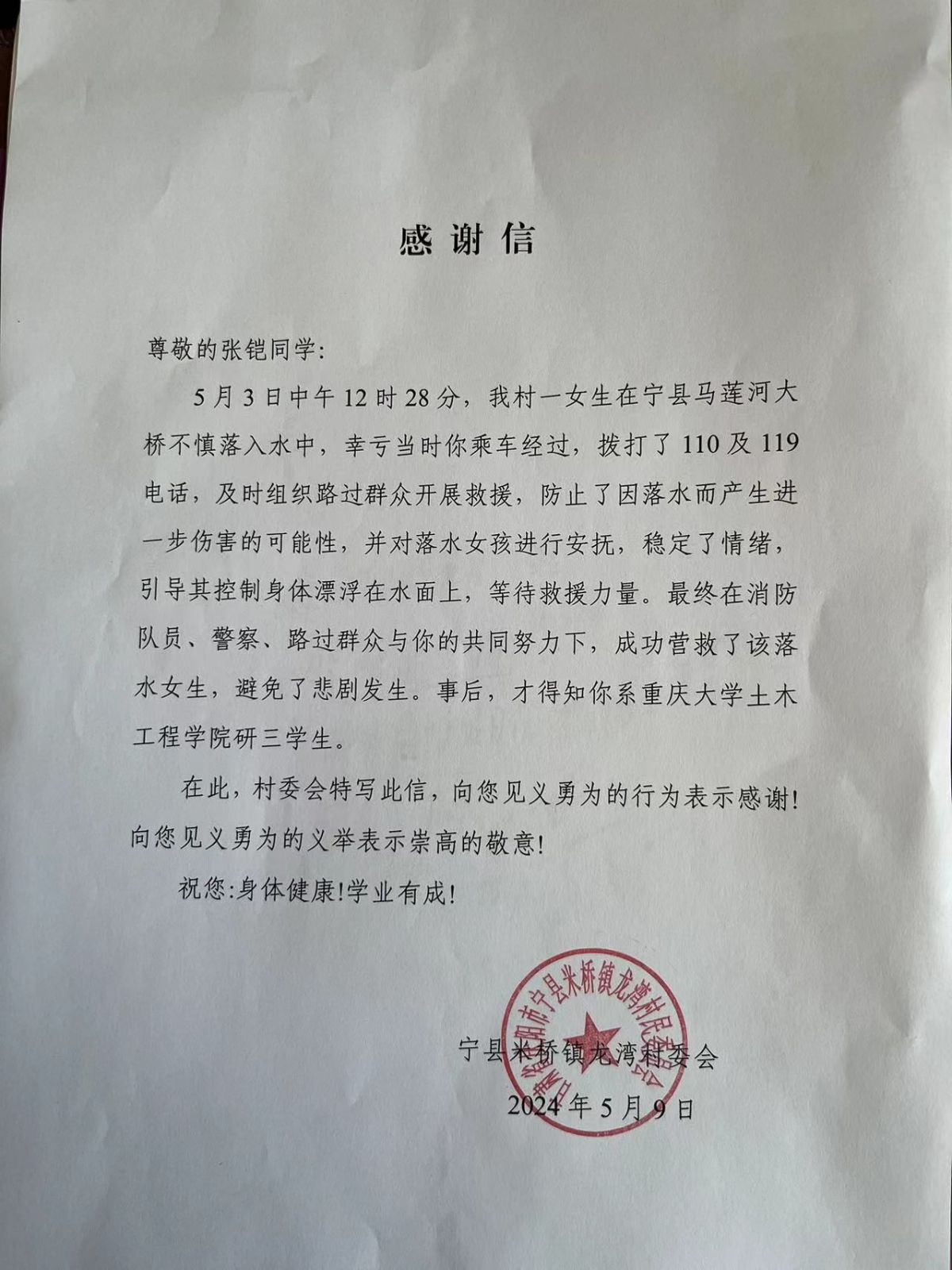 5月8日,米橋鎮(zhèn)龍灣村村委會(huì)向張鎧同學(xué)發(fā)來感謝信,表達(dá)了他們對(duì)張鎧見義勇為行為的感激和敬意!