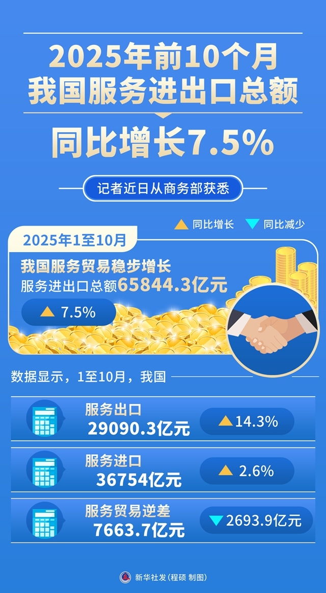 摘要:記者近日從商務(wù)部獲悉,2025年1至10月,我國服務(wù)貿(mào)易穩(wěn)步增長,服務(wù)進出口總額65844.3億元,同比增長7.5%。